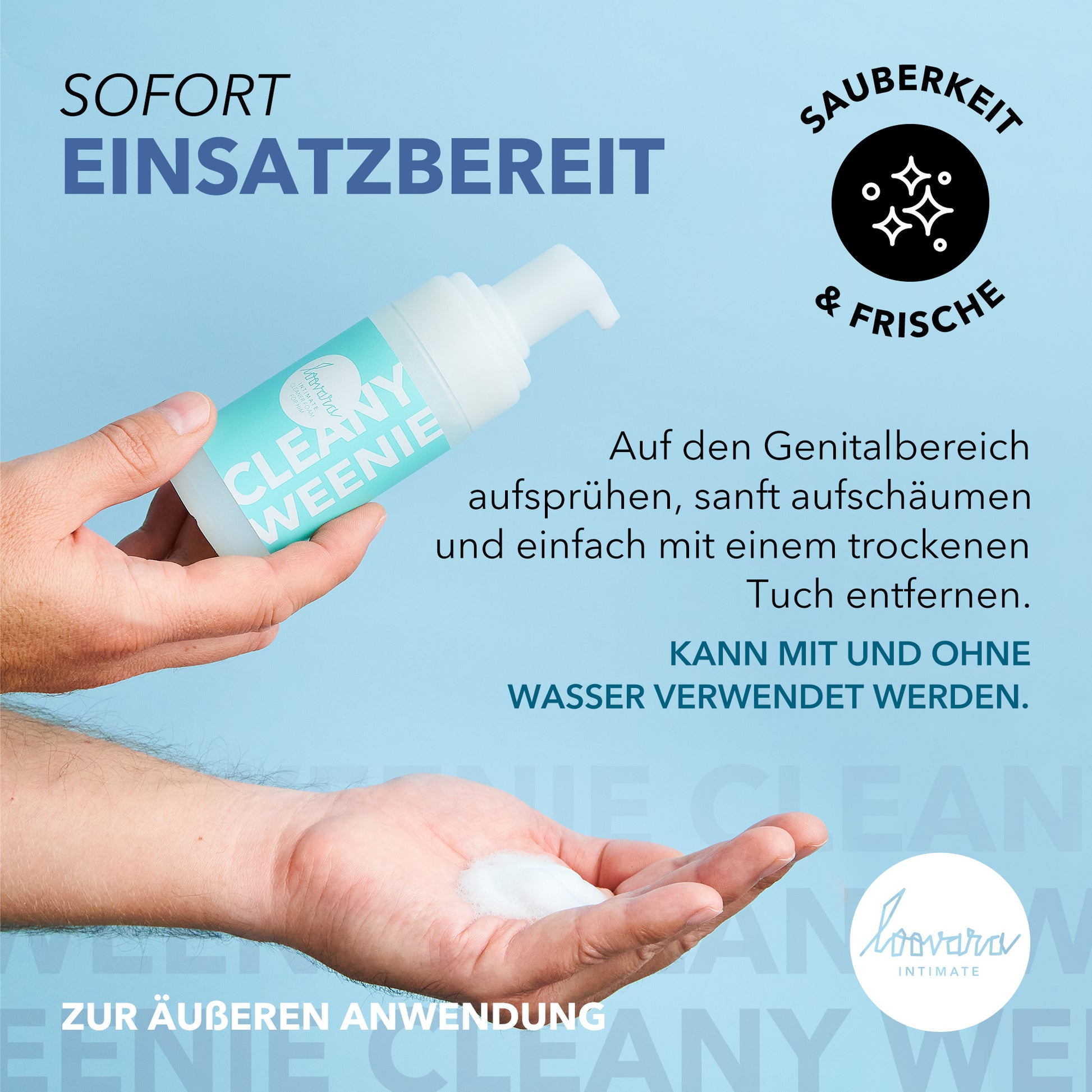 Der Loovara "Cleany Weenie" Intim-Waschschaum für ihn reinigt die besonders empfindliche Haut rund um den Penis und Genitalbereich. Die sanfte Reinigung eignet sich für ein sauberes und frisches Gefühl "zwischendurch" genauso wie vor und nach der Rasur/Enthaarung.